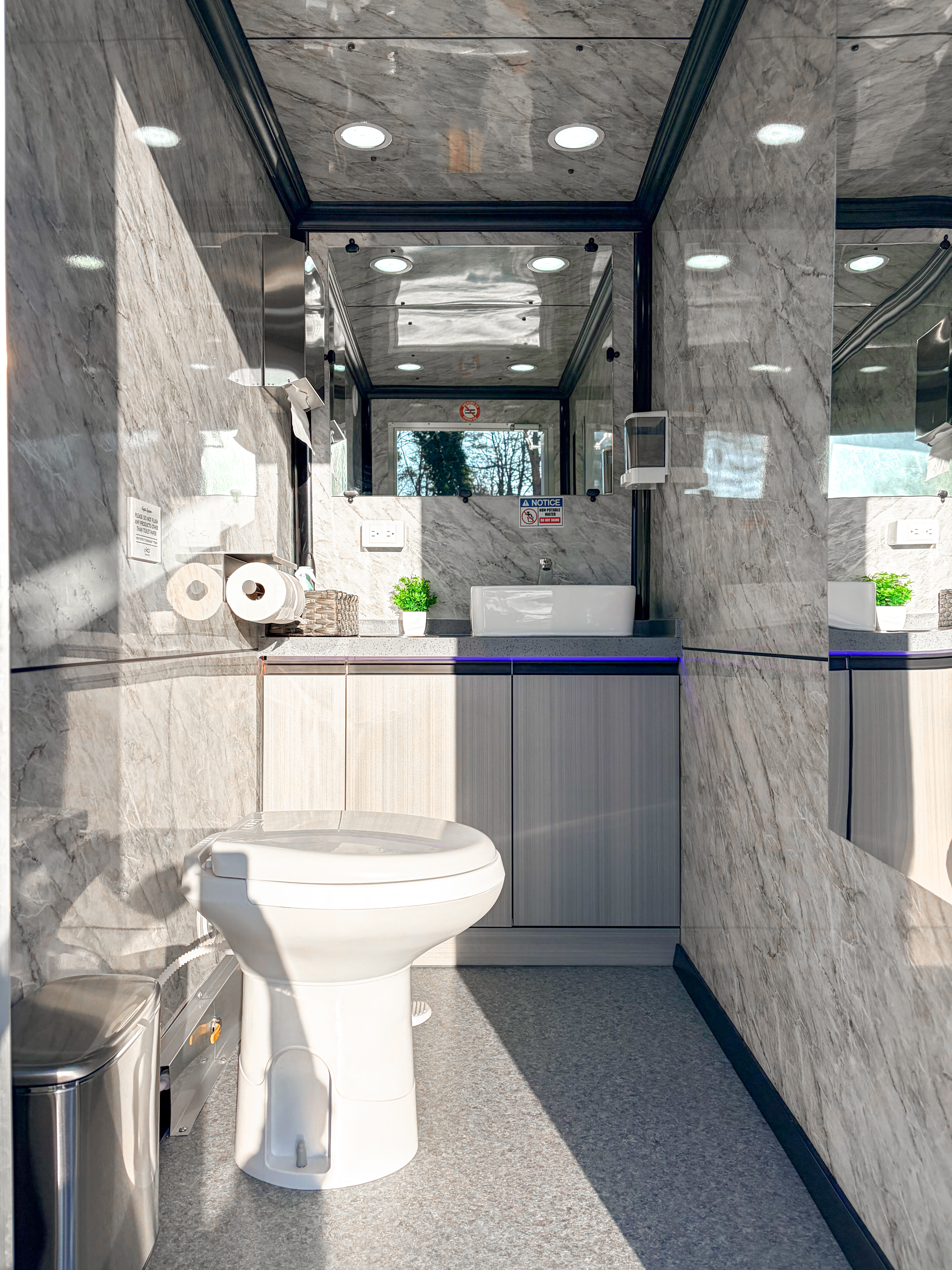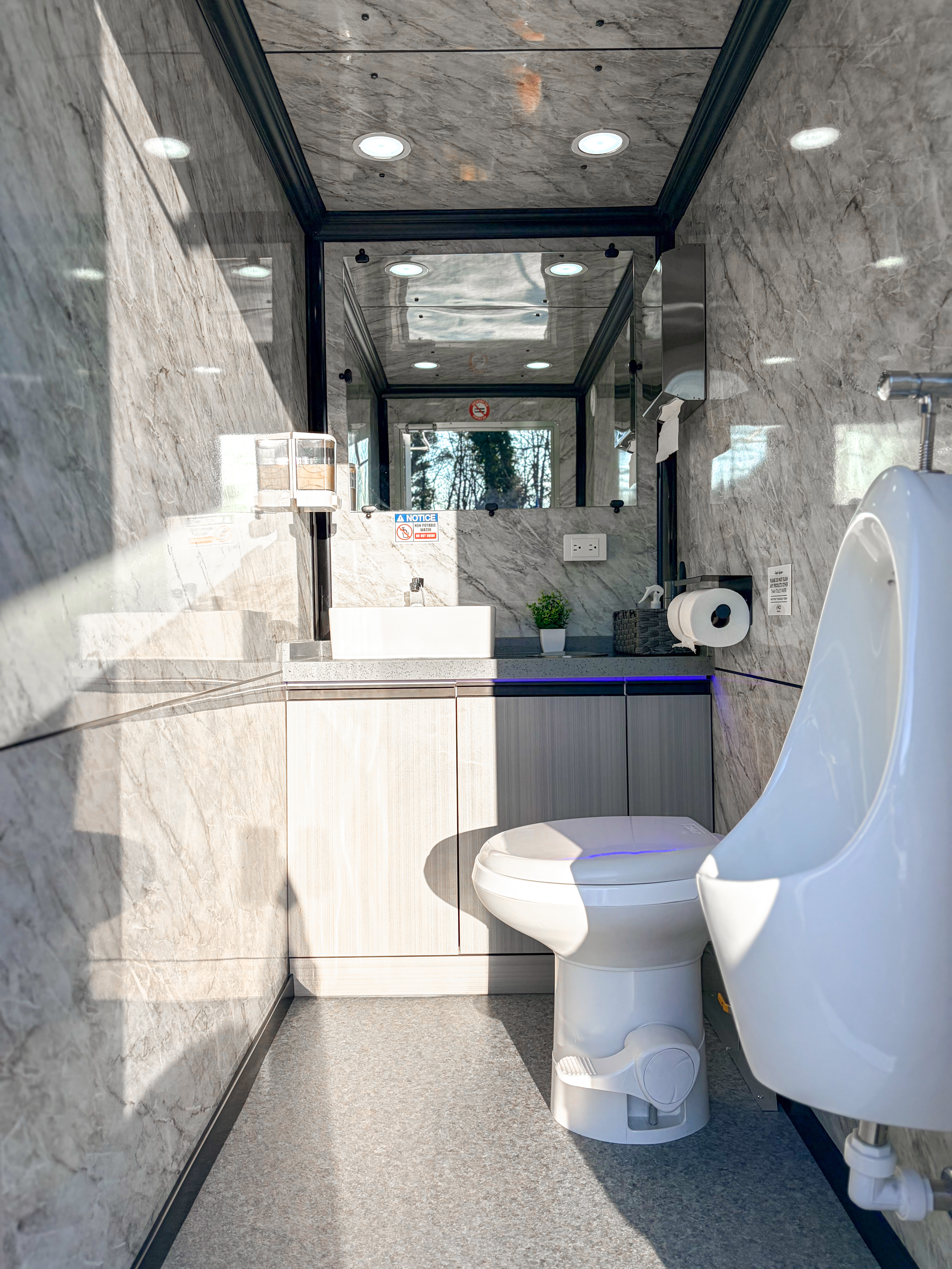 - 2 private restroom stalls (one per sex/side)
